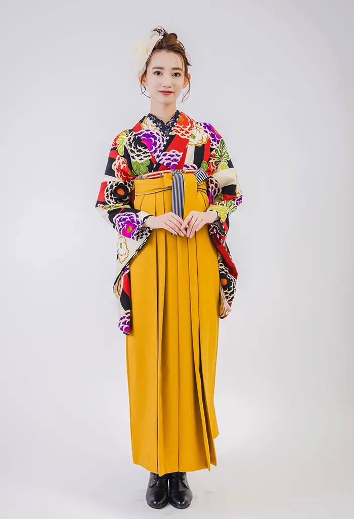 鮮やかな柄の場合は無地や落ち着いた色味の袴を合わせることで、洗練された印象になります。