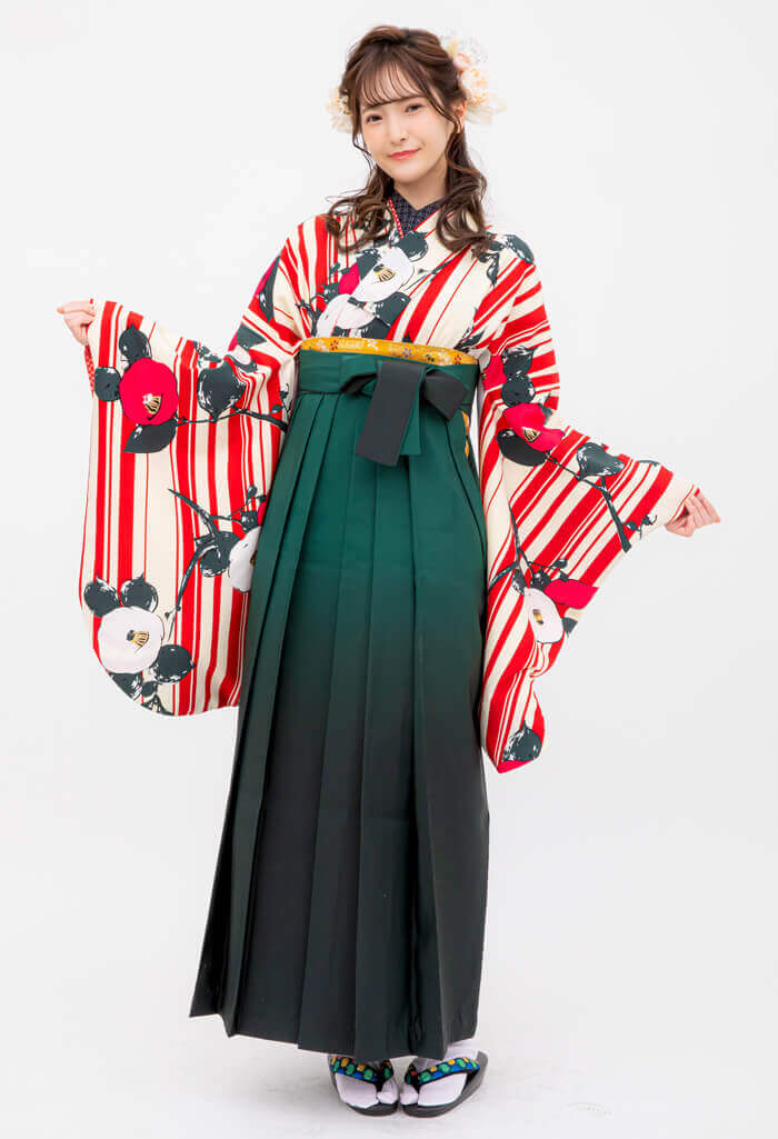 【卒業式袴レンタル】白地赤縞に椿×フカミドリボカシ