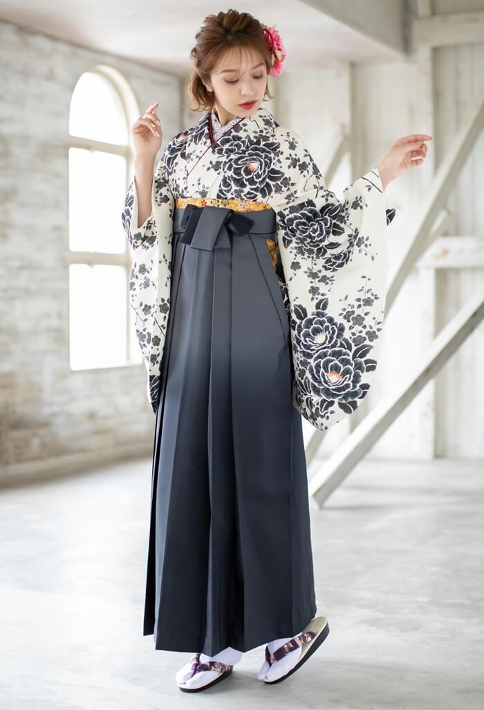 裾に向けてグレーから黒色へ変化する袴に、オフホワイトを基調とする振袖を合わせたコーデです。