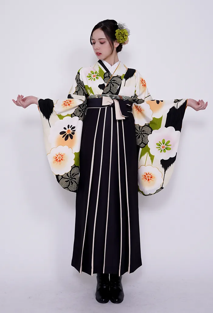 クリーム矢絣に白梅×クロクリームライン