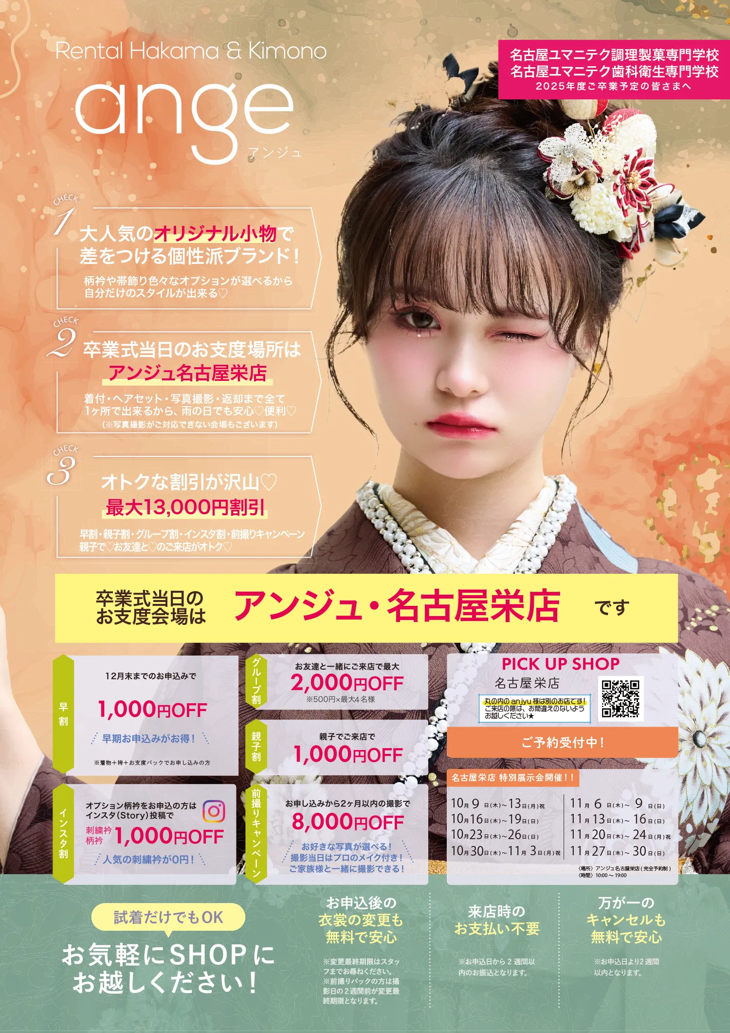 卒業式袴レンタルで着付け・ヘアセット・写真撮影ができるアンジュ