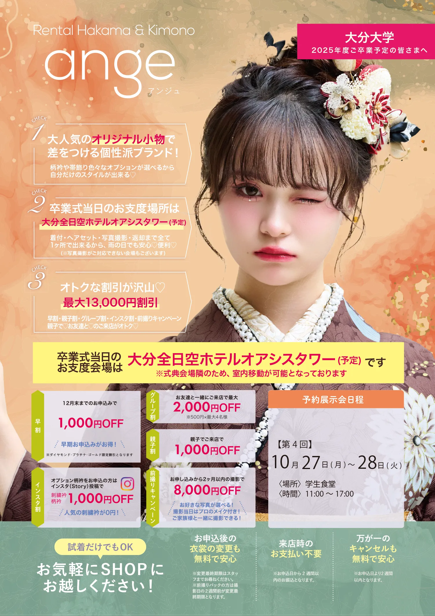 卒業式袴レンタルで着付け・ヘアセット・写真撮影ができるアンジュ