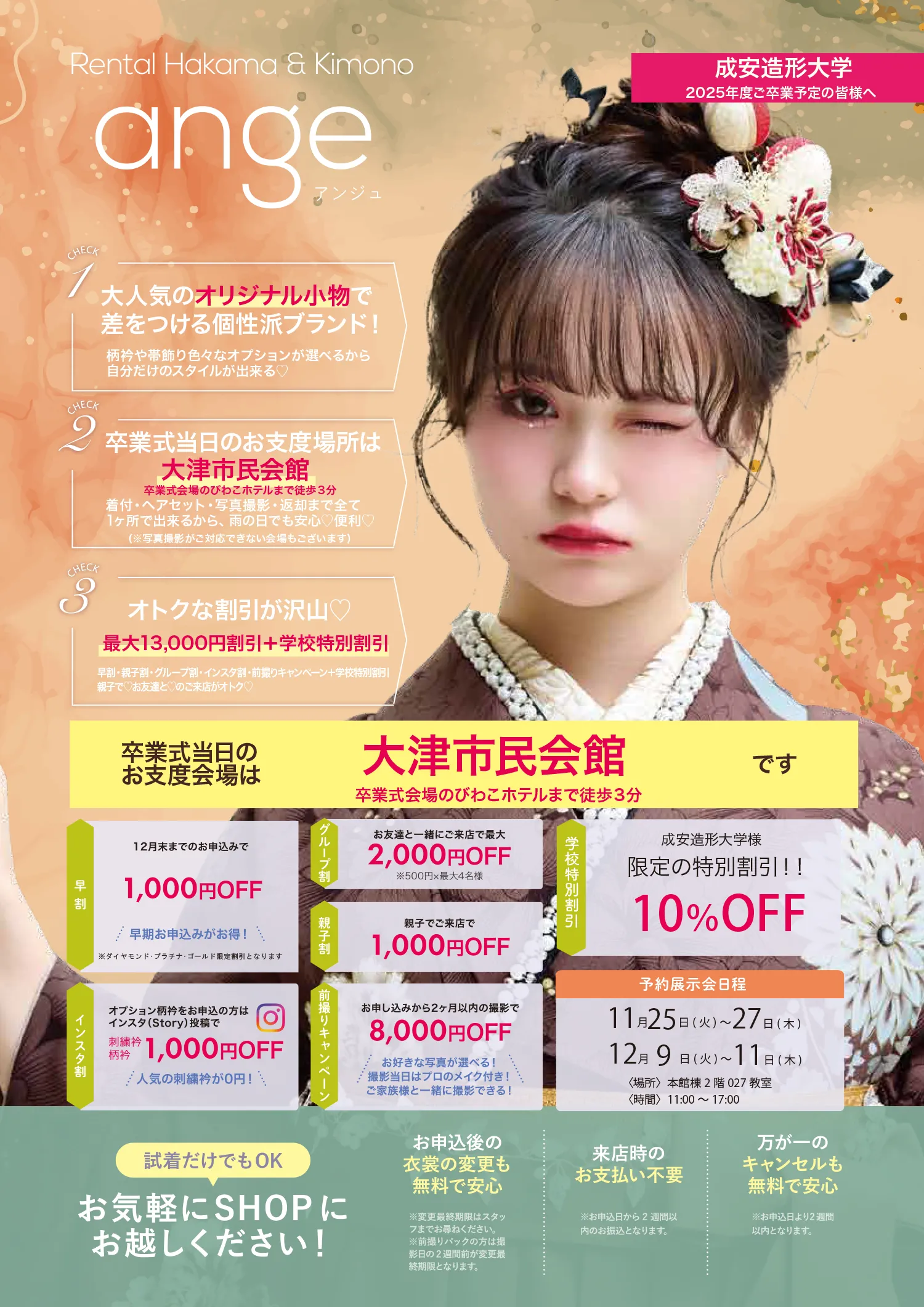 卒業式袴レンタルで着付け・ヘアセット・写真撮影ができるアンジュ